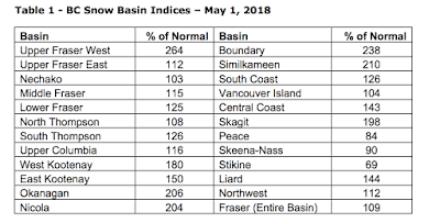 And snowpack in British Columbia, from which the Columbia River drains was also very high (see table)